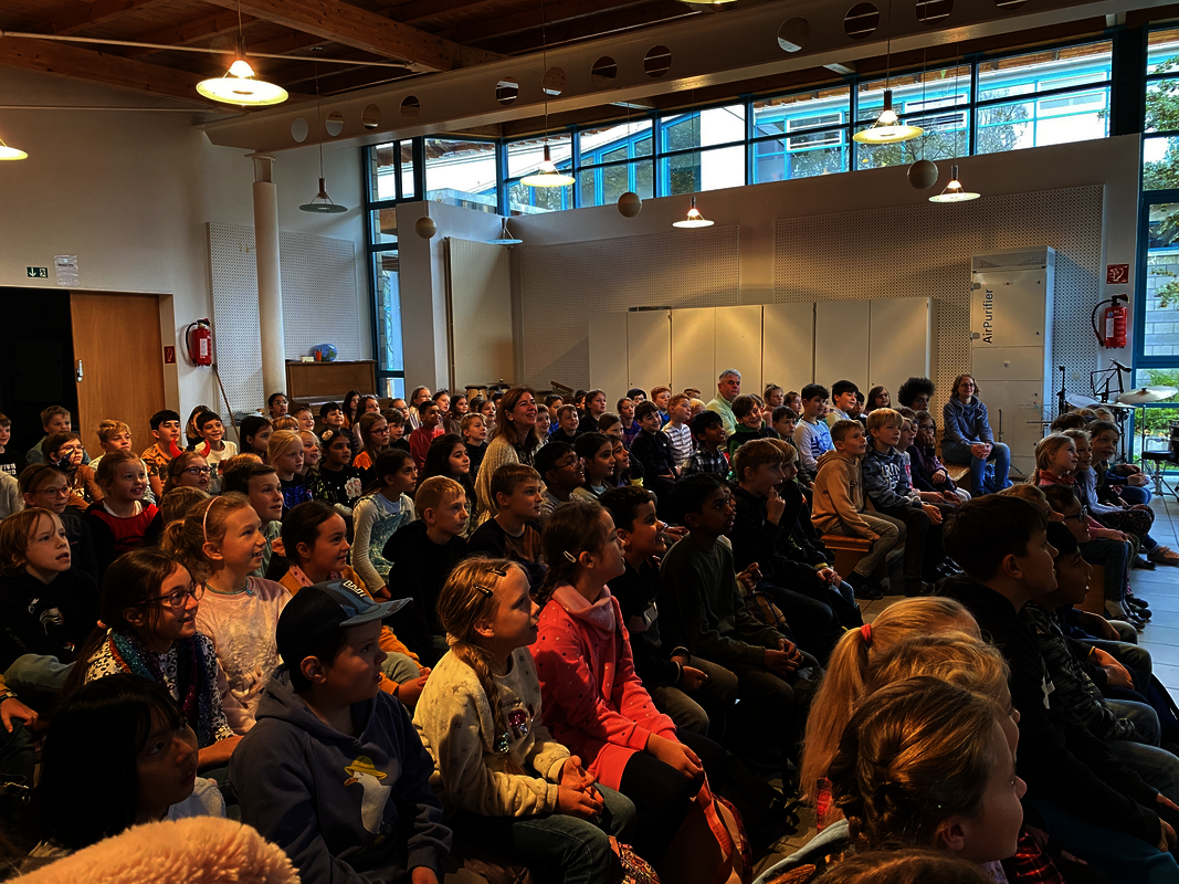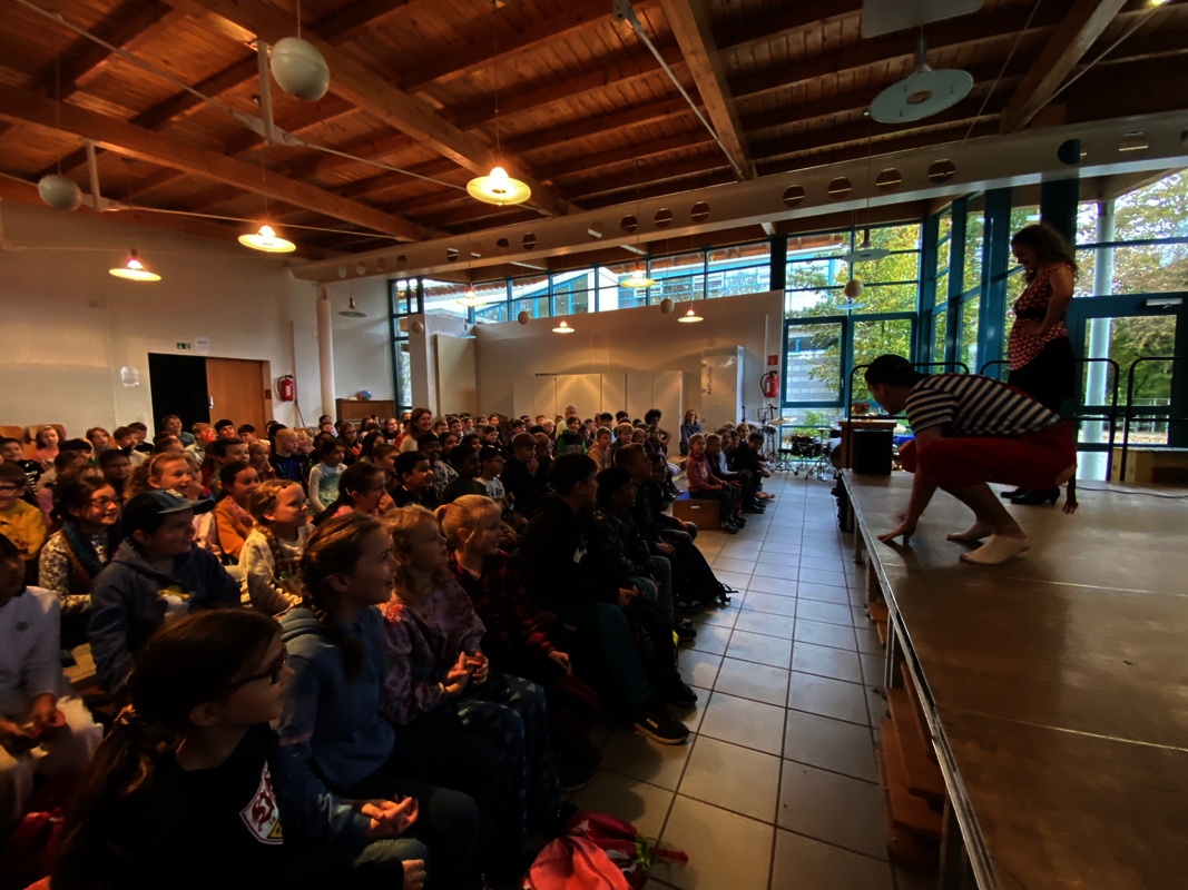 Am Dienstag, 31.10.2023, gastierte zum zweiten Mal das "Phoenix Theatre" bei uns in der Schule. Gezeigt wurde das Stück „The Giantˋs Treasure“ für die dritten und vierten Klassen in englischer Sprache. Das Stück war auch für Lernanfänger im Fach Englisch gut zu verstehen. Nach der Aufführung hatten alle Kinder Gelegenheit, mit den englischen Schauspielern ins Gespräch zu kommen, Dies wurde reichlich von den Schülerinnen und Schülern genutzt. Das Lernen einer Fremdsprache und reines Vergnügen bildeten eine Einheit.