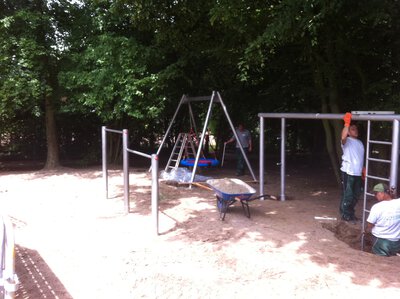 Wie geplant kommt es noch vor den Sommerferien zur Aufstellung unserer neuen Schulhofgeräte. In Südkamen sind das ein neues Klettergerüst und eine Nestschaukel. Am Teilstandort Heiliger Josef ergänzt eine Nestschaukel das Bewegungsangebot für die Kinder.
